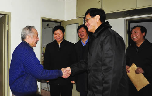 1月28日,铁道部党组成员、副部长卢春房代表部党组到铁科院看望并慰问周镜院士和冯叔瑜院士,并向他们致以节日的问候。铁道部人才办副主任郭宏,院长安路生、院党委书记王君历等陪同慰问。图为卢春房到周镜院士家中慰问。