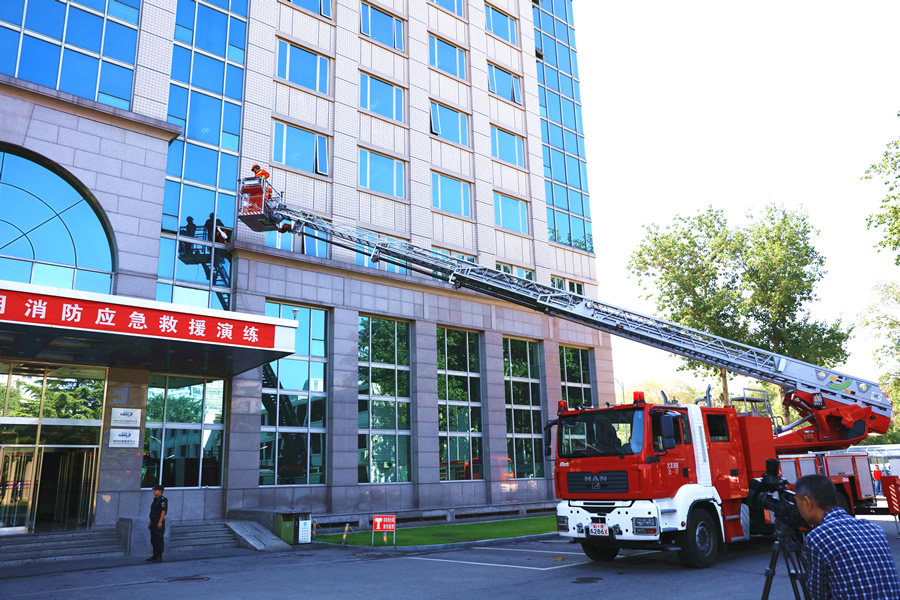 在确认现场火势难以控制后,消防中控室迅速拨打火警电话向消防队报警支援。消防人员到达现场后立即开展火灾扑救,进入火灾现场抬出受伤人员进行救治,并利用云梯车对高层被困人员进行救援,整个演习持续约30分钟,在规定时间内圆满地完成整个消防演习的预定全过程。