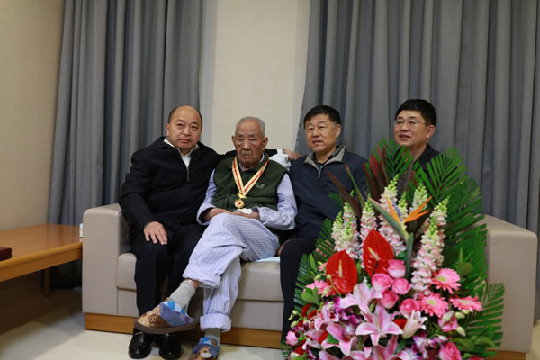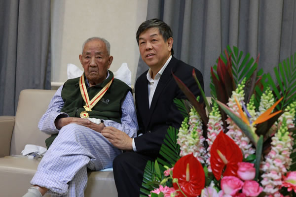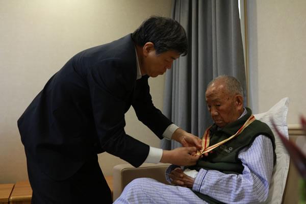 陆东福总经理为老红军苏华佩戴“纪念中国工农红军长征胜利80周年”纪念章