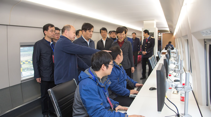 黄民副总经理首先添乘了CRH380AJ-0202高速综合检测列车,在施卫忠书记的陪同下现场察看了综合检测列车上轨道检测、动车组动力学、空气动力学、弓网受流、通信、轨旁信号等检测系统和车内设施,认真听取了试验技术人员的介绍,详细询问了设备功能及状态,对连续奋战在试验列车上的科技工作人员表示慰问。