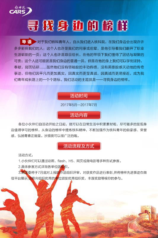 开展“寻找身边的榜样”活动。围绕院新时期企业文化建设,鼓励青年员工找寻身边的榜样,以身边人、身边事儿为题材,讲好铁科故事,从中提炼铁科精神,不断加强作为铁科青年的自豪感、荣誉感,弘扬青春正能量。