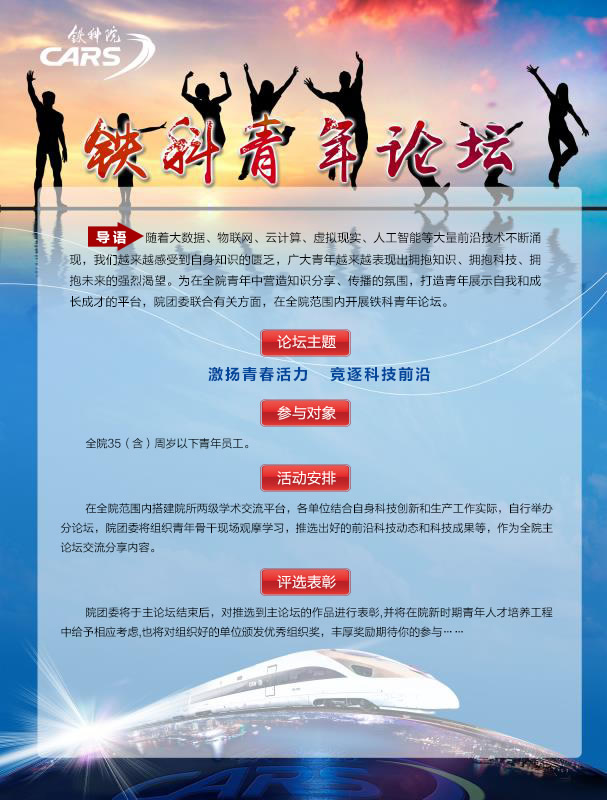 开展“铁科青年论坛”活动。在全院搭建院所两级学术交流平台,大力营造学术交流和分享氛围,为青年人提供展示自我、学习交流的平台,让知识在全院青年中传播,让新思想、新思维充分涌流。