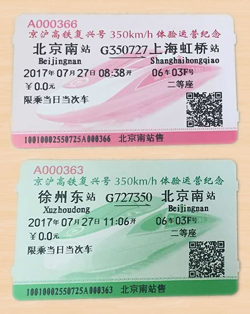 作为体验运营的纪念,每位乘客都拿到了两张特殊的车票,一张是红色的北京南站—上海虹桥站,车次是G350727,一张是绿色的徐州东站—北京南站,车次是G727350,车票上都写着“京沪高铁复兴号350km/h体验运营纪念”。该车票是由我院12306团队在总公司相关部门的指导下制作完成的。
