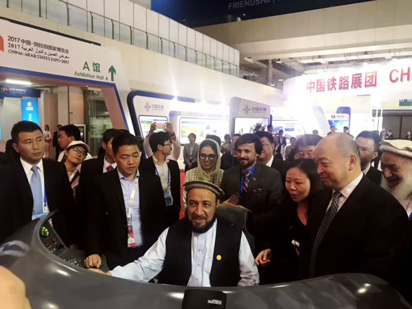 按照总公司安排,施卫忠书记、总公司科技部钱征宇副主任还在展馆共同接待了出席中阿博览会的外国政要和贵宾。阿富汗、毛里塔尼亚、几内亚政要团饶有兴致地参观了中国铁路展区并体验了模拟驾驶之旅。贵宾们对中国铁路特别是高铁近年来取得的发展成就表示赞赏。