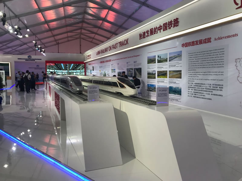 中国铁路展区总面积203平方米。展区以展板、模型、模拟驾驶等形式,集中展示了中国铁路“砥砺奋进的五年”发展成就,并通过路网规模及规划、“复兴号”动车组、典型国际合作项目等元素,展现中国铁路发展的规模、质量和速度,反映中国铁路在工程建设、装备制造、运营管理等领域的优秀成果和先进水平,表达中国愿与世界各国铁路务实合作、共享成果的美好愿望。按照总公司要求,我院信息所承担了中国铁路展区的策划、设计和组织任务。