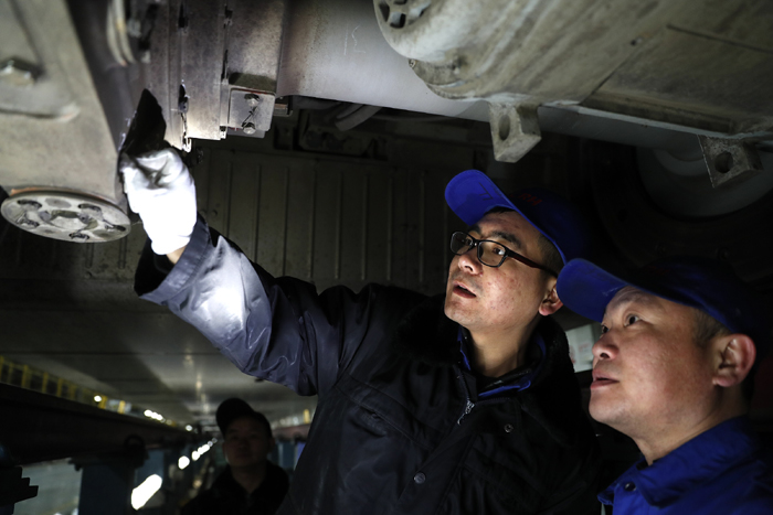 动车组检修师在北京南动车运用所检修库对“复兴号”进行仔细检修