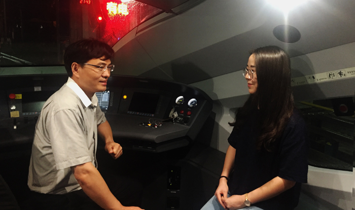 结束在车厢内的采访后,跨过一道车门,车外的温度与车厢内的明亮凉爽截然不同。身穿蓝色制服的地勤机械师在执行检修作业,检修工人打着手电筒沿车逐次检查,维护人员手持长刷在清洁车体……又是灯火通明的一夜。