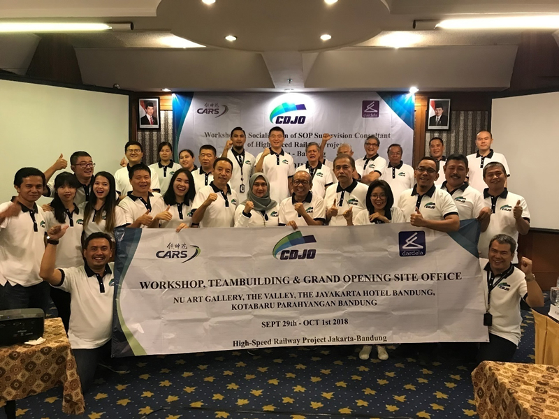 2018年9月29日-9月30日,由铁科院集团公司和印尼PT DARDELA YASA GUNA组成的雅万高铁监理咨询联合体CDJO(CARS DARDELA JOINT OPERATION)在印尼万隆举行现场办公室启用仪式及监理咨询标准化工作流程研讨会,雅万高铁项目业主方KCIC(PT KERETA CEPAT INDONESIA CHINA,中印尼高铁合资公司)主要负责人应邀参加活动,CDJO中印尼双方全体成员参加了活动。