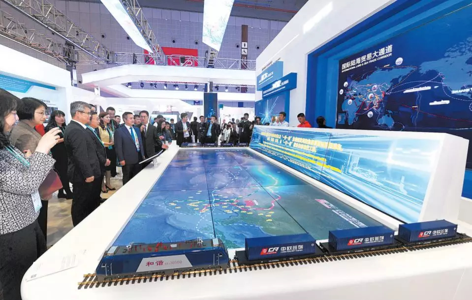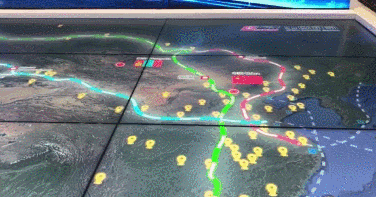 中欧班列电子沙盘位于中国馆开放发展板块。沙盘通过裸眼3D动画,展示了中欧班列开行情况及取得的成果,演示了从欧洲驶出的中欧班列,途经欧洲各国驶向中国之旅,说明了中欧班列的开行意义。