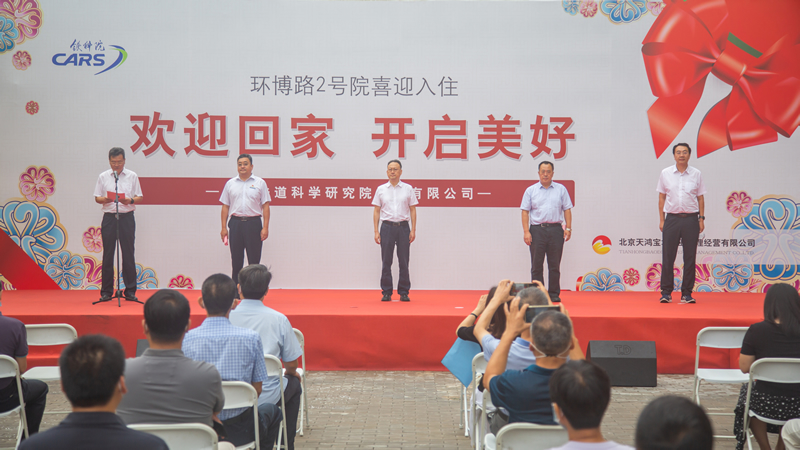 8月16日,金风习习,笑语盈盈,位于东五环环博路2号院的集团公司东郊住宅区内,“欢迎回家,开启美好,环博路2号院喜迎入住”的展牌喜庆而明亮,作为集团公司“我为群众办实事”重点项目的铁科院东郊职工住宅正式交付。集团公司党委书记、董事长叶阳升出席活动,并向职工代表发放了钥匙模型,共庆乔迁之喜。集团公司总工程师赵有明参加活动并致辞。集团公司工会主席李守义主持活动。集团公司副总工程师、相关单位和部门负责人、业主代表,以及物业公司人员等参加活动。