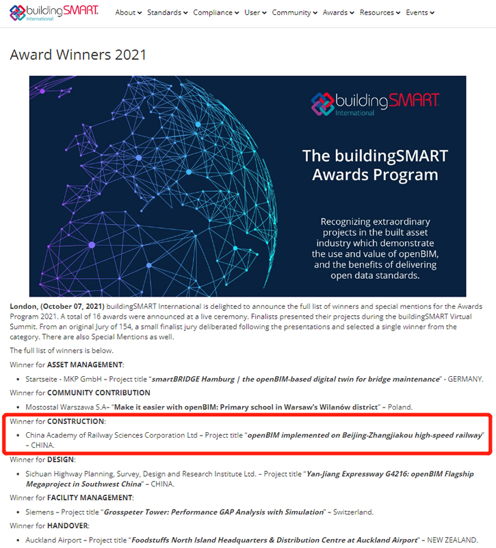 10月7日,在铁路BIM联盟的精心组织下,由中国铁道科学研究院集团有限公司和京张城际铁路有限公司共同申报的“openBIM在京张高铁上的应用”(openBIM Implemented on Beijing-Zhangjiakou High-Speed Railway)在36个施工类项目中脱颖而出,于bSI秋季峰会颁奖典礼上获得buildingSMART openBIM国际大奖赛(以下简称“bSI大奖赛”)施工类大奖,这也是铁路BIM联盟获得的首个bSI国际大奖、第三个bSI国际奖项。