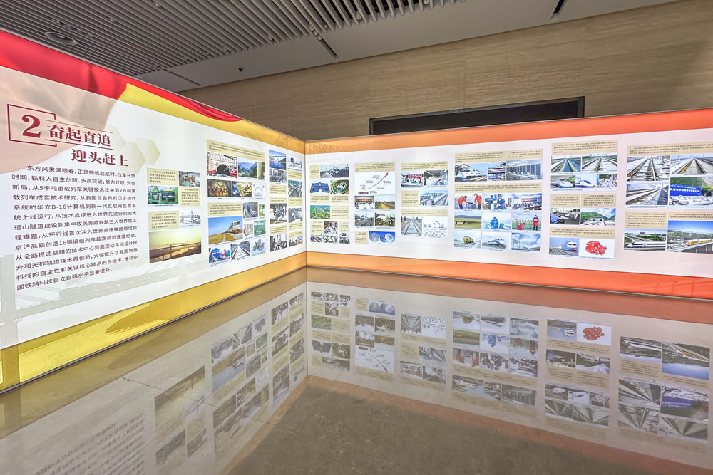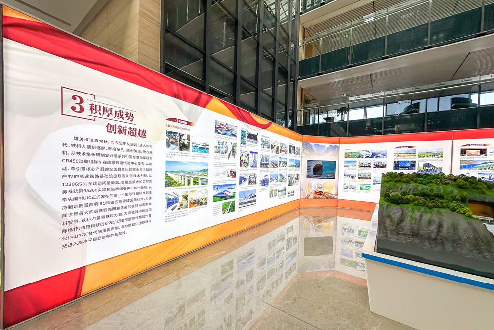 “厚积成势·创新超越”篇章:技术牵头研制复兴号系列中国标准动车组、完全自主知识产权的高速铁路基础设施建造关键技术创新、12306成为全球交易量最大的实时票务系统、95306实现货运票据电子化和一单制、智能高铁技术体系被国际铁路联盟(UIC)采纳……铁科人扬帆逐梦、奋楫争先,原创策源、抢占先机,为建成世界最大的高速铁路网和先进的铁路网贡献铁科智慧,为高铁技术树起国际标杆、铁路科技创新发生历史性整体性格局性变化作出重要贡献,有力推动中国铁路科技进入高水平自立自强的新阶段。