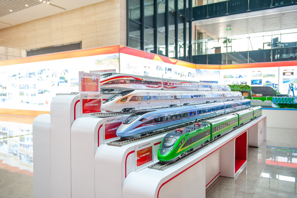 在展览现场,复兴号系列动车组模型、铁建所创新成果沙盘、轨道交通分布式光伏整体解决方案沙盘,以及铁路用长续航多旋翼无人机、隧道综合测量机器人、隧道开挖面安全智能监测机器人等自主研发的新一代铁路建设检测智能设备,闪耀亮相,尽显创新创造活力。