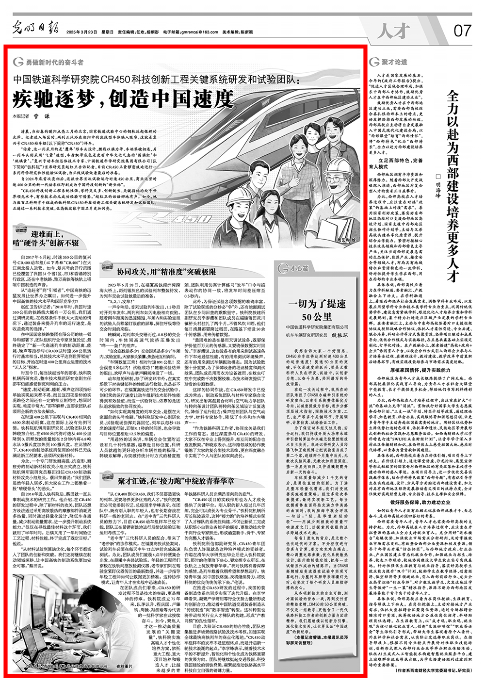 在团队成员们看来,CR450的研发过程不仅是技术的突破,更是精神的传承。铁科院成立75年来,以茅以升、程庆国、卢肇钧、周镜、冯叔瑜等为代表的一批科学家在此接续奋斗。如今,聚焦人才这一推动高质量发展的“关键变量”,铁科院实施高端人才个性化培养方案,依托重大工程、重大项目培养和锻造人才,让越来越多的青年铁路科研人员充满昂首向前的底气。