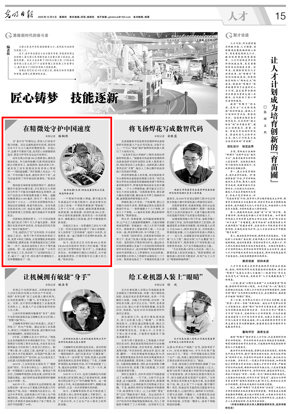 10月9日,《光明日报》刊发《匠心铸梦 技能逐新:在精微处守护中国速度》的文章。