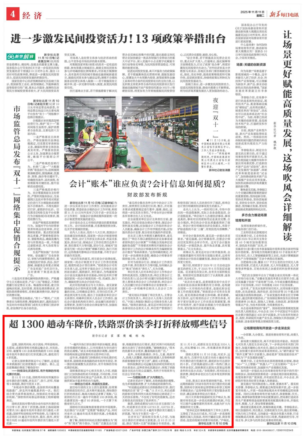 11月11日,《新华每日电讯》刊发《超1300趟动车降价,铁路票价淡季打折释放哪些信号》。