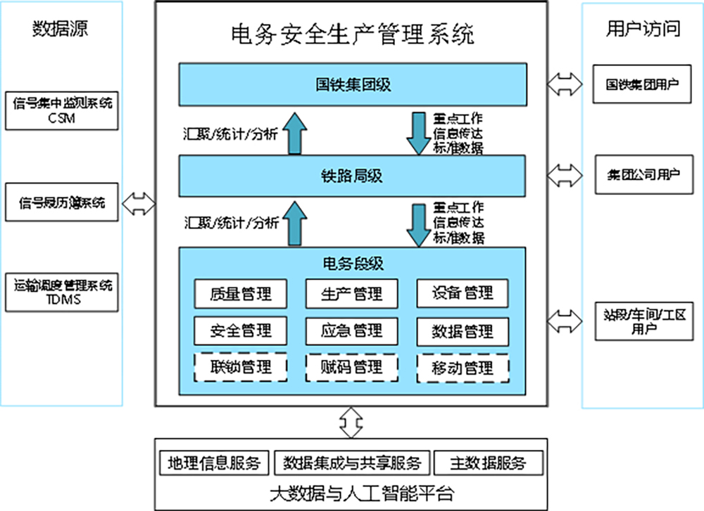 系统整合设备监测、生产作业、设备履历、GIS平台等多源数据,建立统一编码与数据标准,六大核心模块(安全、生产、设备、应急、质量、基础数据)支撑三级应用,基于国铁集团云平台,采用微服务架构实现功能模块解耦,支持灵活扩展与快速迭代。实现全路/全局电务数据集中管理与宏观分析,实时掌握设备总体状态、生产任务进展,为安全风险趋势研判、维修决策提供系统支撑。建立跨层级数据共享机制,促进全路、全局资源统筹调配与协同联动,提升整体管理效能。