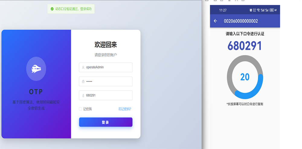 OTP双因子认证系统使用时间戳、安全种子密钥、复杂国密算法等因素生成了安全动态口令,该动态口令具备了时效限制、抗穷举攻击、不可复制、一次性认证等特点,可保障铁路信息化系统及安全设备登录场景下的身份认证安全。当系统用户通过账户、静态口令和动态口令进行登录时,动态口令身份认证和交易签名验证平台会对登录用户进行身份真伪辨别从而实现登录用户的身份认证安全。