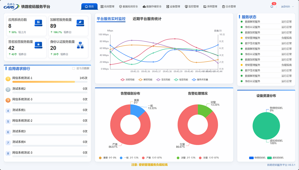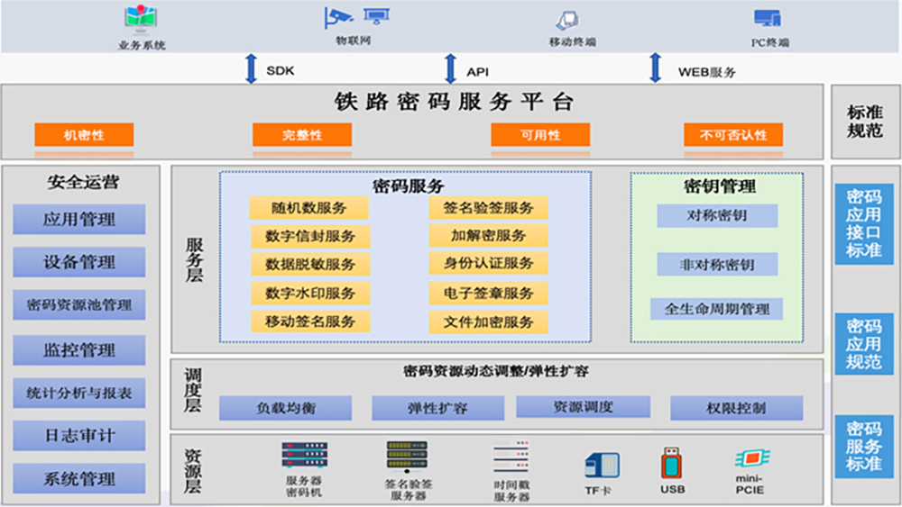 铁路密码服务平台:护航铁路数字动脉,打造密码能力新基座。在铁路行业数字化与国密改造进程中,面对密码设备分散、算法复杂、管理调用困难等挑战,铁路密码服务平台应运而生。平台以密码设备为支撑,以密码运算为基础,通过对多样化设备与复杂算法的统一整合与高效调度,有效解决了密码能力与应用系统之间的调用管理难题。平台提供标准、开放的服务接口,实现密码资源的集中化管控与敏捷供给,全面满足铁路各领域应用系统对密码应用的实际需求。