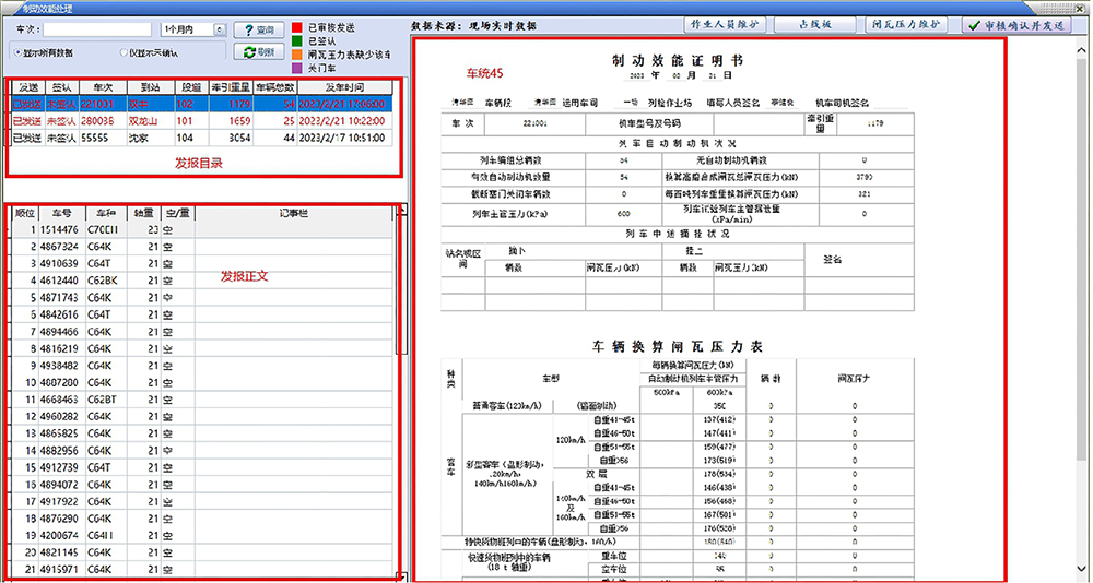 列车制动效能证明书(车统45)是记载列车制动效能的情况,作为车站与司机间及铁路局集团公司间对列车制动效能的交接依据。目前,车统45 在始发站由车辆作业人员打印出来并与现车核对正确后,将纸质车统45 交给司机;列车到达终到站后,司机将纸质车统45 交给终到站作业人员。车统45 电子化传递系统以现车系统为基础,利用既有铁路安全生产网、国铁集团安全平台以及4G/5G 公网作为信息通道,替代了传统纸质车统45 传递方式;车统45 电子化传递系统,可实现车统45 在列检作业人员与机车乘务员间的无纸化传递,通过提供列车发报查询、车统45 自动计算、车统45 发送流转、闸瓦压力维护等功能减少结合部问题的产生,有利于降低运输成本、推进运输组织改革创新、提高统计质量等重要现实意义。
