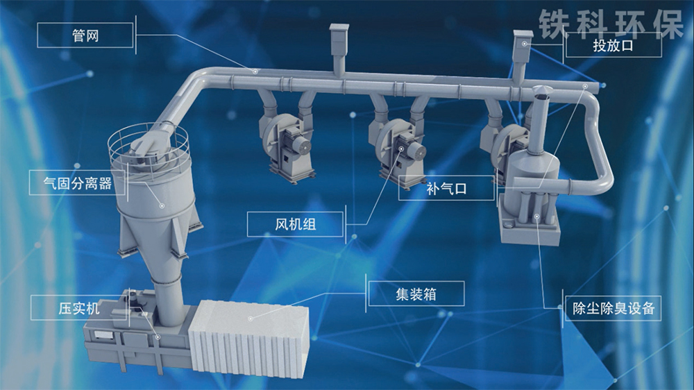 垃圾气力输送系统是一种新型、绿色、智能、高效的垃圾收集技术,将垃圾收集运输过程从地上转至地下。主要原理是利用气力输送技术,通过预先铺设的管道系统,由风机产生的负压高速气流将垃圾携带至垃圾中央收集站,再经气固分离及压实设备,垃圾由转运车运送至垃圾处置场。