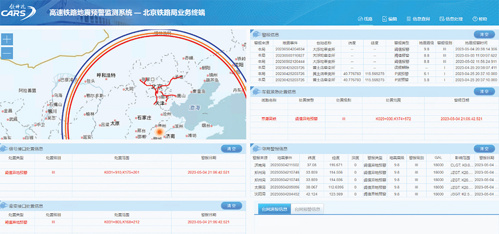高速铁路地震预警监测系统适用于200 km/h 及以上铁路,是国内具有完全自主知识产权的实现多源预警、警报分级处置的系统。高速铁路地震预警监测系统由设置在铁路局集团公司的地震预警监测中心系统和分布在高速铁路沿线的现场监测设备构成。