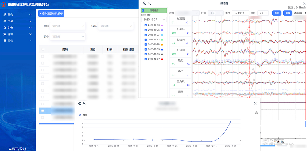安全是发展的基石,科技为安全注入智慧动能。铁科院集团公司牵头组织实施郑西高铁运营十年和大秦铁路周期性安全评估等重大任务,构建面向铁路全生命周期的数据驱动型安全评估模式,为铁路一线科学研判风险、制定治理策略提供依据。铁路基础设施检测监测数据平台支持全路140余条高铁线路轨道几何和接触网1C检测数据的全链路自动化处理,线路冻胀预警结果发布时效性由24小时缩短为2小时。
