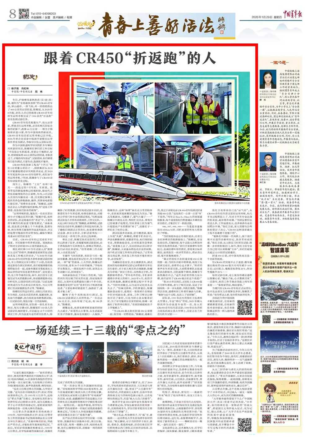 1月29日,《中国青年报》刊发《跟着CR450“折返跑”的人》的专题文章。