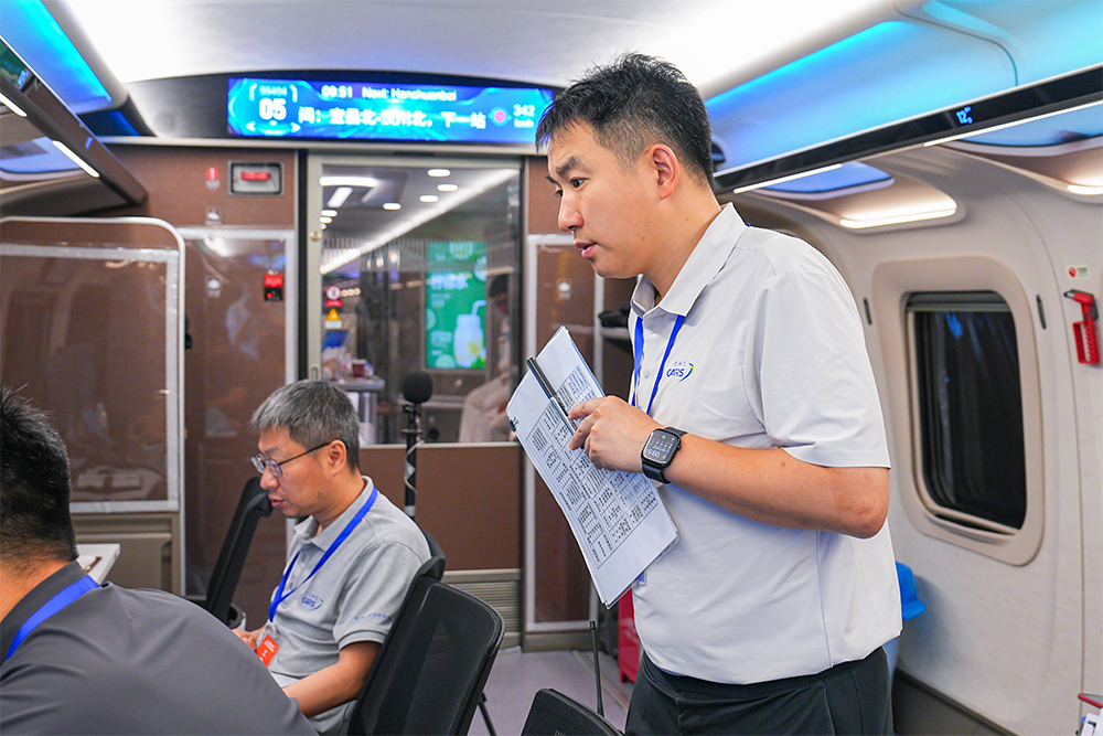 列车上,陈璨的“工位”也和7有关——改造过的7号车厢。车厢里,旅客常见的舒适座椅已经被拆除,取而代之的是沿窗摆放的办公桌椅。车内,4名试验人员面向车窗坐成一排,目光锁定屏幕上起伏的多色参数曲线。窗外,风景如电影胶片般后掠。“侧着坐容易晕。”陈璨说,这种坐法会让人的感知受到影响,但“这是工作需要,也是我们独有的视角”。