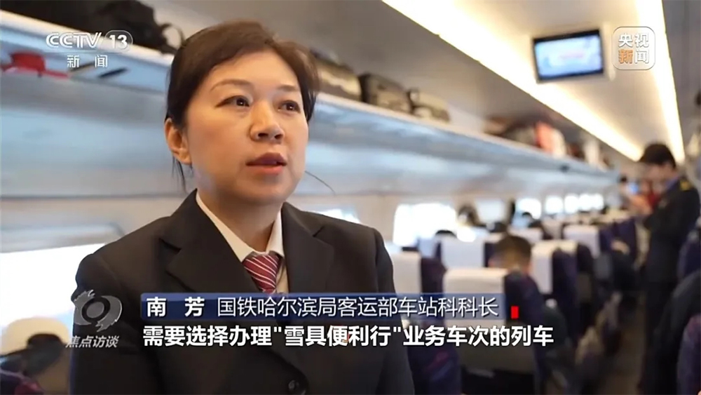 中国铁路哈尔滨局集团有限公司客运部车站科科长 南芳:春运期间,客流比较大,如果有携带雪板出行意愿的旅客,需要选择办理雪具便利行业务车次的列车,并且办理预约。下一步也会根据雪具便利行的试行情况,统筹考虑旅客座位需求和旅客携带雪板需求。