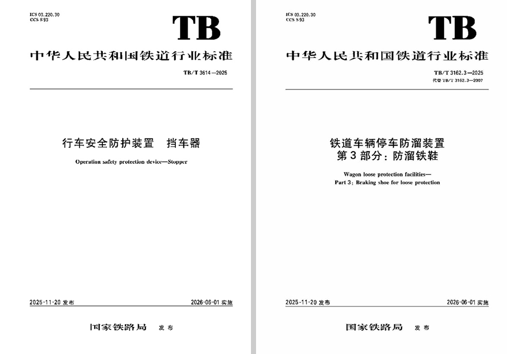 春风浩荡满目新,捷报如种发新芽。铁科院集团公司运经所持续做好铁路技术规章与运输技术标准研究,承担多项铁道行业标准与国铁集团技术规章、技术标准制修订研究工作。近日由运经所承担制定的两项铁道行业标准TB/T 3614-2025《行车安全防护装置 挡车器》、TB/T 3162.3-2025《铁路车辆停车防溜装置 第3部分:防溜铁鞋》正式发布,将于2026年6月1日实施。