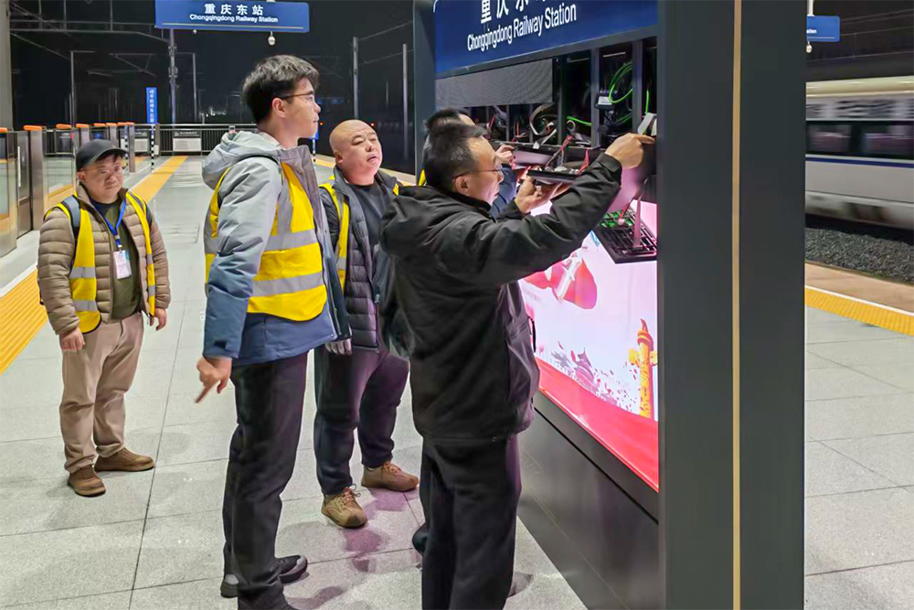 “每一块屏幕都是车站与旅客沟通的窗口,屏幕亮不亮,画面清不清晰,直接影响旅客是否能第一时间获取准确信息。”研发工程师刘祎然带领显示屏设备部署团队,扛着设备、攀爬梯架,完成从候车大厅的综合显示屏到站台的动态提示屏的设备安装,又马不停蹄进行亮度调试、内容同步、故障测试。