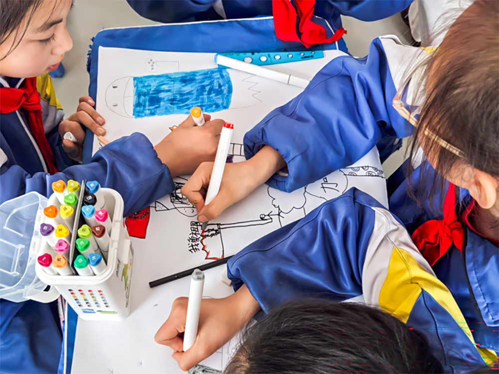 通号所孟艺瑄以“从蒸汽轰鸣到高铁飞驰”为主线,用鲜活的讲述带着孩子们穿越中国铁路百年奋进史。在“我心目中的未来列车”绘画环节,孩子们小组协作,用画笔释放想象力:“我画的未来列车可以飞上天!”“我的车可以在海底跑,还能看到鲸鱼!”“我要让列车用彩虹做轨道!”童言与创意齐飞,课堂化作梦想的月台。