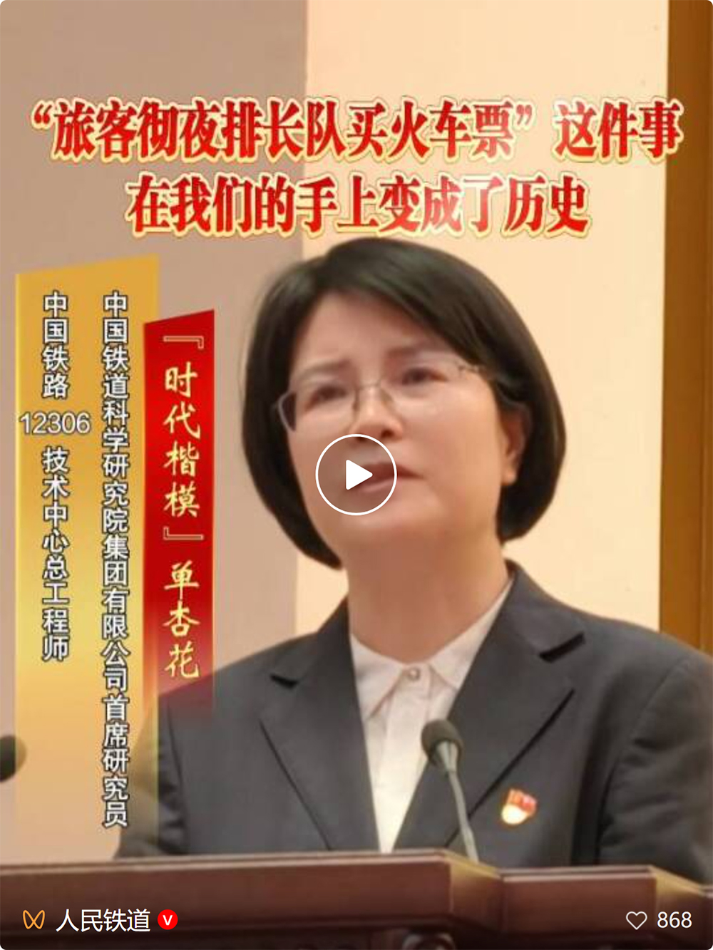 单杏花,中国铁道科学研究院集团有限公司首席研究员、中国铁路12306技术中心总工程师。2024年12月,中央宣传部授予单杏花同志“时代楷模”称号。