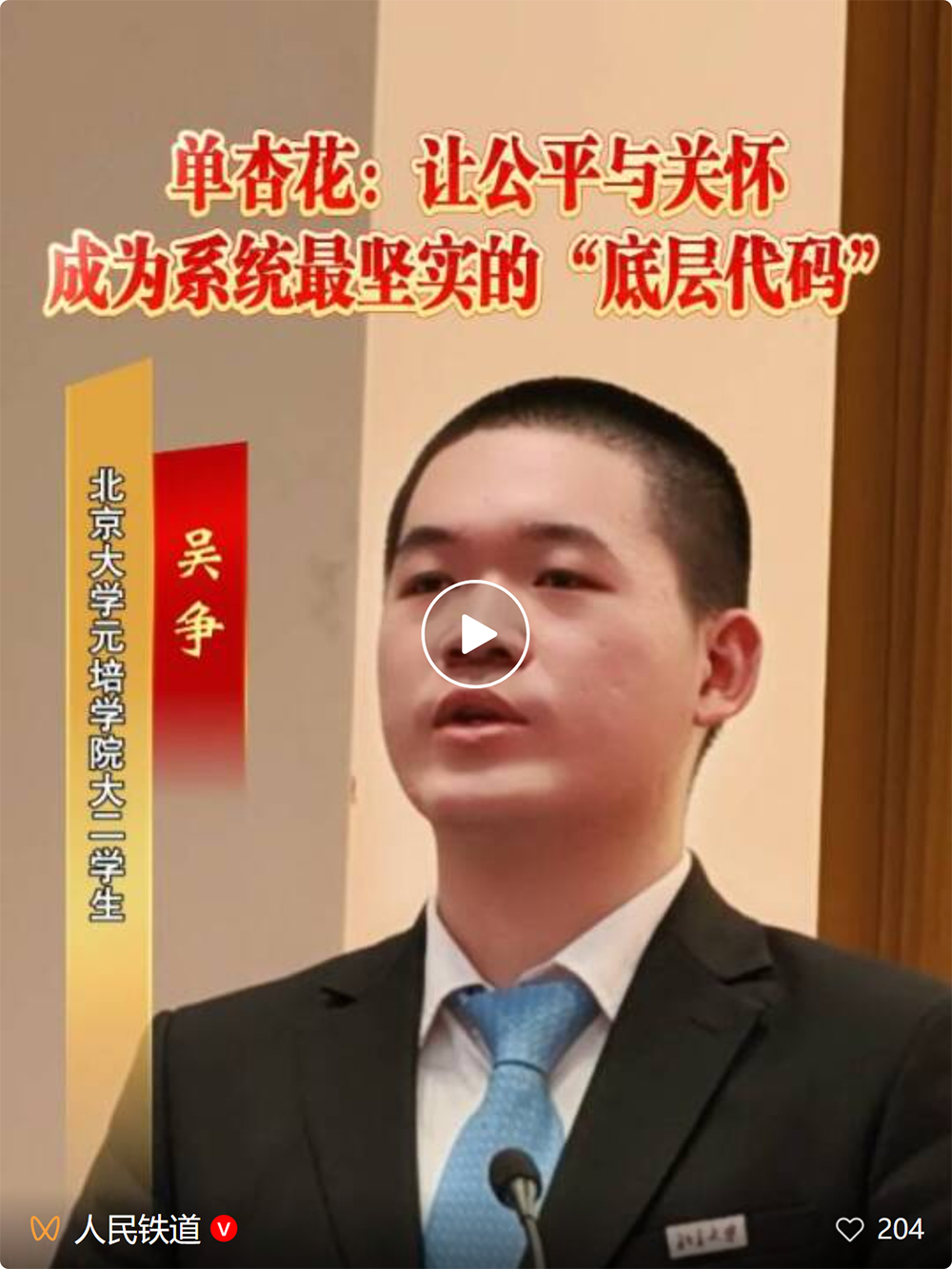报告团成员吴争是北京大学元培学院大二学生。单老师告诉他,研发铁路12306,就是要把“人民铁路为人民”的宗旨融入每一个算法逻辑,让公平与关怀成为系统最坚实的“底层代码”。