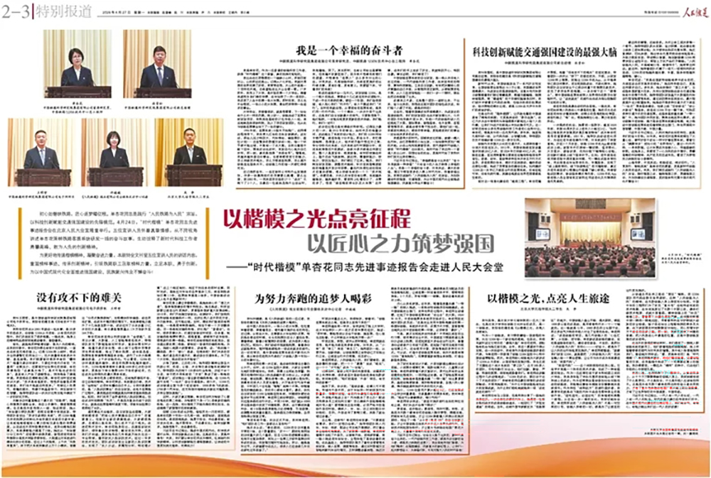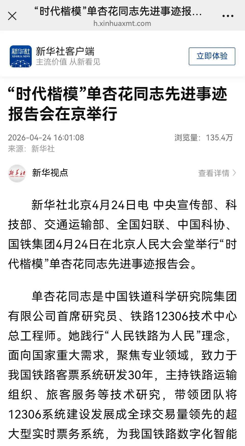 初心如磐映铁路,匠心逐梦耀征程。单杏花同志是践行“人民铁路为人民”宗旨,以科技创新赋能交通强国建设的先锋模范。4月24日,“时代楷模”单杏花同志先进事迹报告会在北京人民大会堂隆重举行。五位宣讲人员怀着真挚情感,从不同视角讲述单杏花深耕铁路客票系统研发一线的奋斗故事,生动诠释了新时代科技工作者勇攀高峰、敢为人先的创新精神。