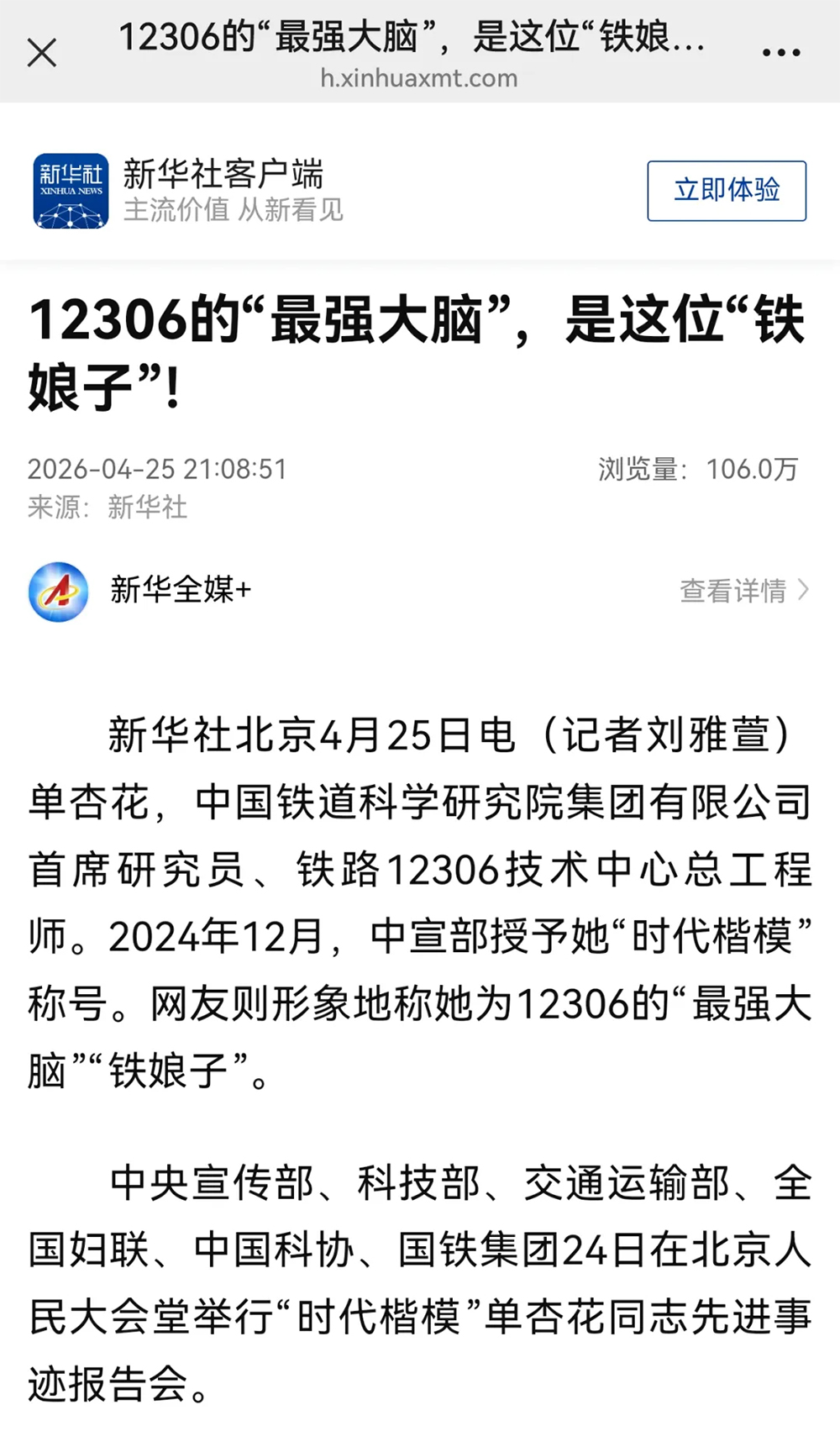 新华社北京4月25日电(记者刘雅萱)单杏花,中国铁道科学研究院集团有限公司首席研究员、铁路12306技术中心总工程师。2024年12月,中宣部授予她“时代楷模”称号。网友则形象地称她为12306的“最强大脑”“铁娘子”。