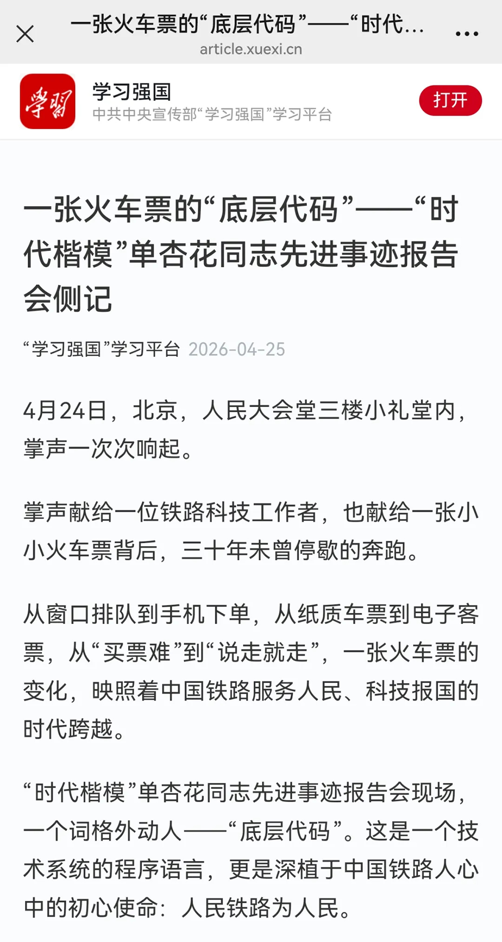 人民大会堂里,掌声终会落下。但那张火车票仍在继续出发。它穿过山河,穿过四季,穿过一代代铁路人的坚守与创新,抵达团圆,抵达梦想,抵达更加辽阔的未来。而它最深处的“底层代码”,始终清晰而坚定——人民铁路为人民。(“学习强国”记者刘思远)