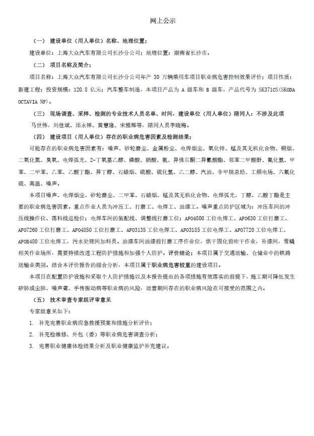 上海大众汽车有限公司长沙分公司年产30万辆乘用车项目职业病危害控制效果评价