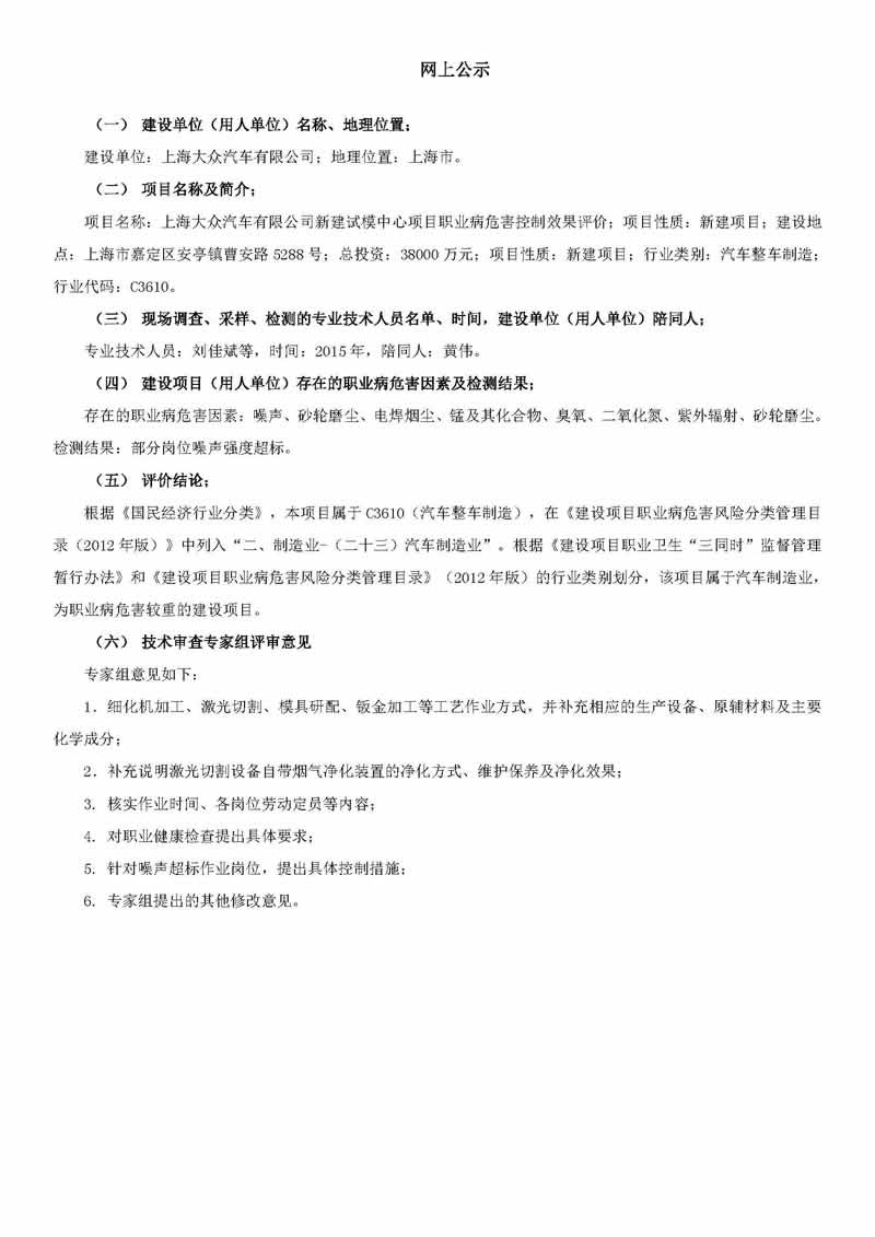 上海大众汽车有限公司试模中心项目职业病危害控制效果评价