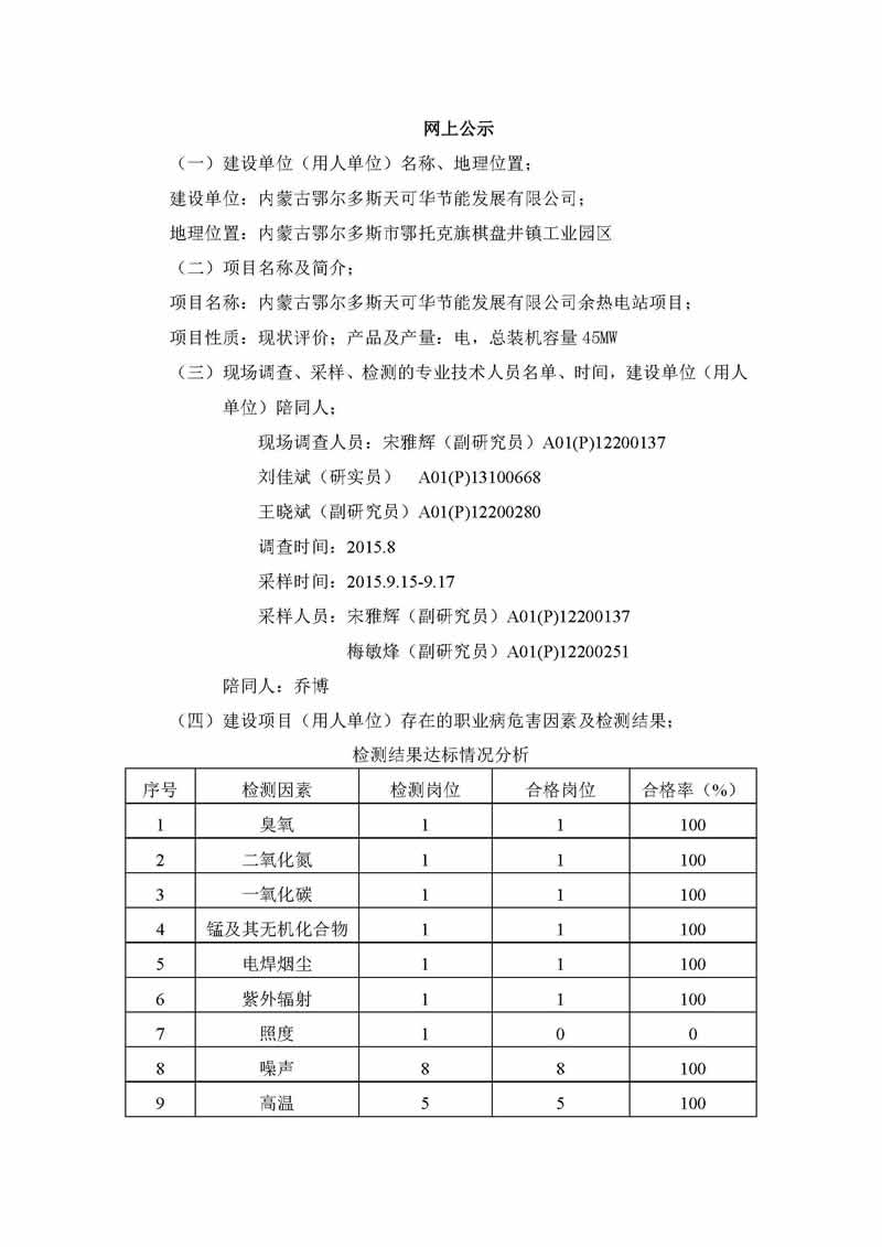 内蒙古鄂尔多斯冶金有限责任公司大型集群电炉低温烟气余热综合利用项目职业病危害现状评价