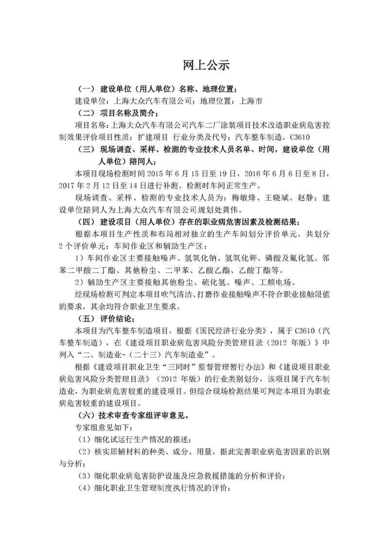上海大众汽车有限公司汽车二厂涂装项目技术改造职业病危害控制效果评价