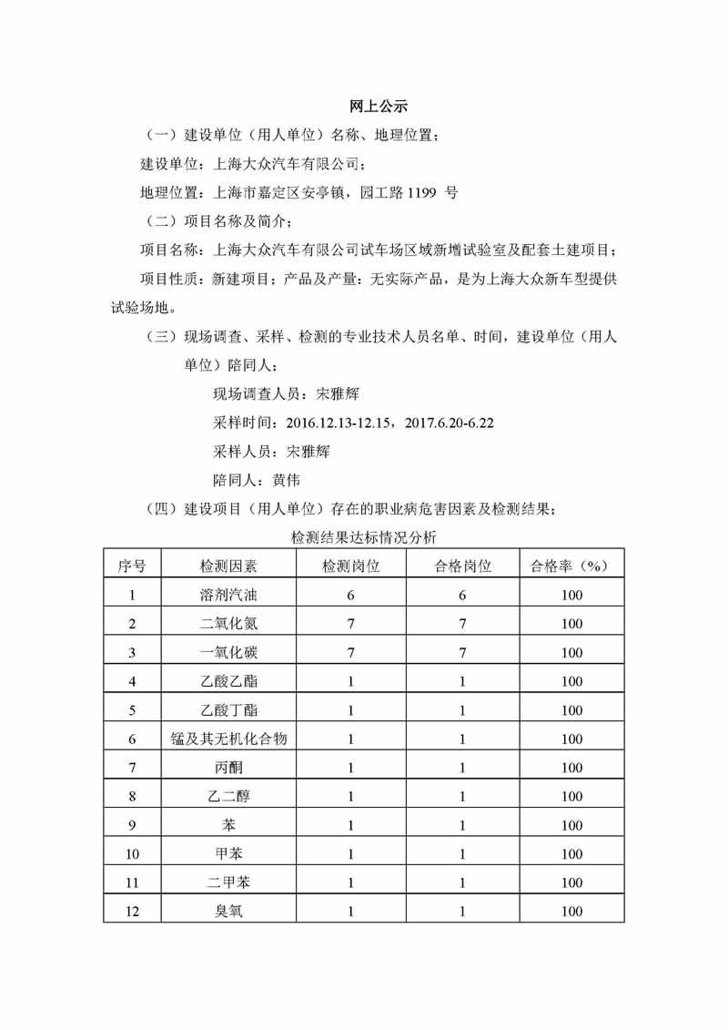 上海大众汽车有限公司试车场区域新增试验室及配套土建项目职业病危害控制效果评价