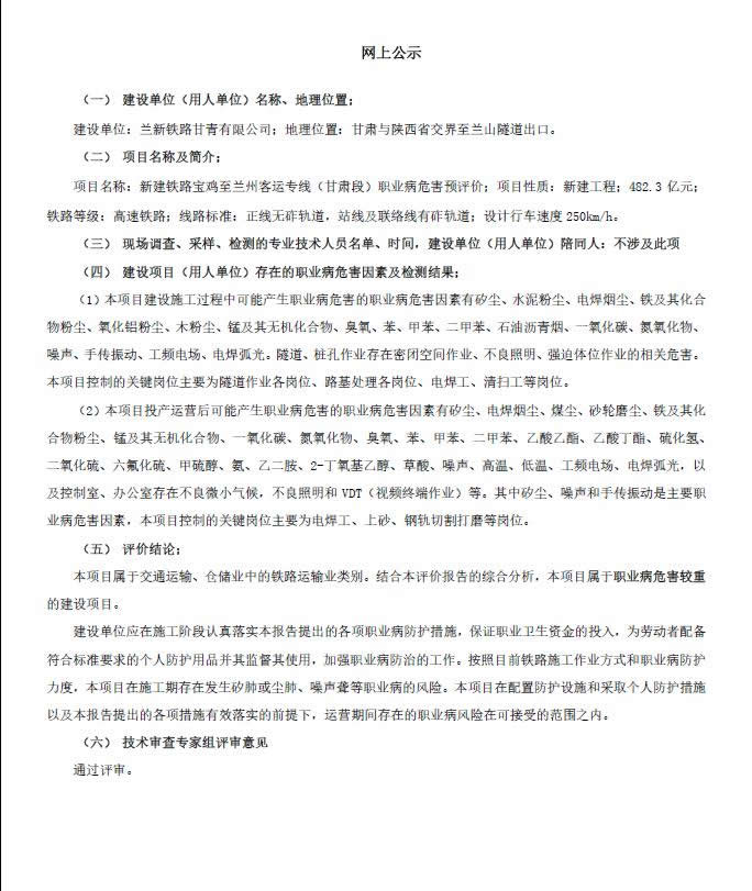 新建宝鸡至兰州铁路客运专线(甘青段)职业病危害预评价