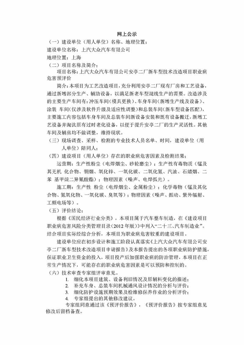 上汽大众汽车有限公司安亭二厂新车型技术改造项目职业病危害预评价