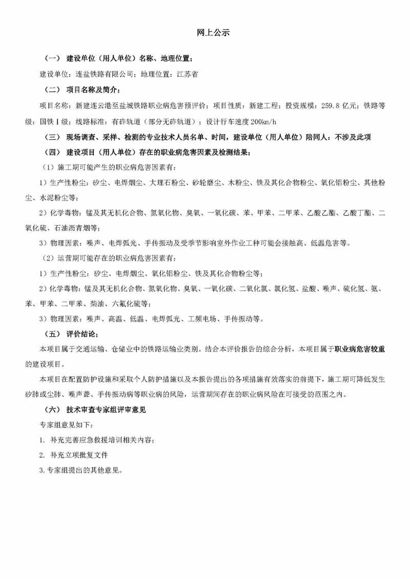 新建连云港至盐城铁路工程项目职业病危害预评价