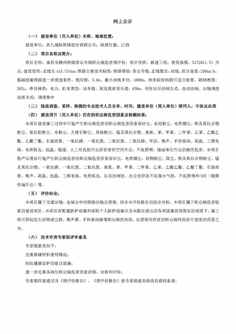 南昌至赣州铁路客运专线职业病危害预评价报告