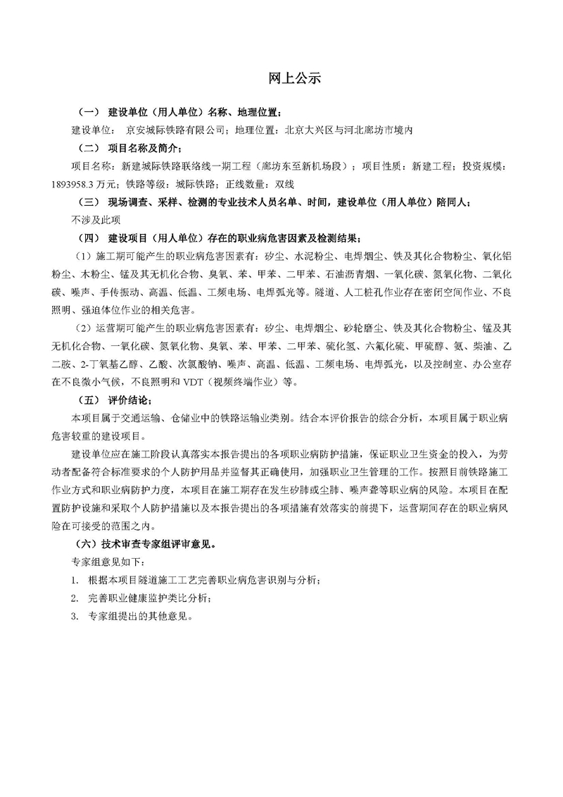 新建城际铁路联络线一期工程职业病危害预评价