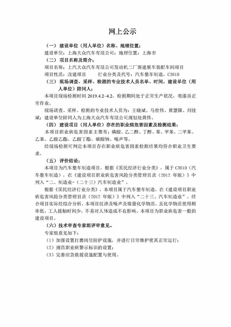 上汽大众汽车新建展车装配车间项目职业病危害控制效果评价