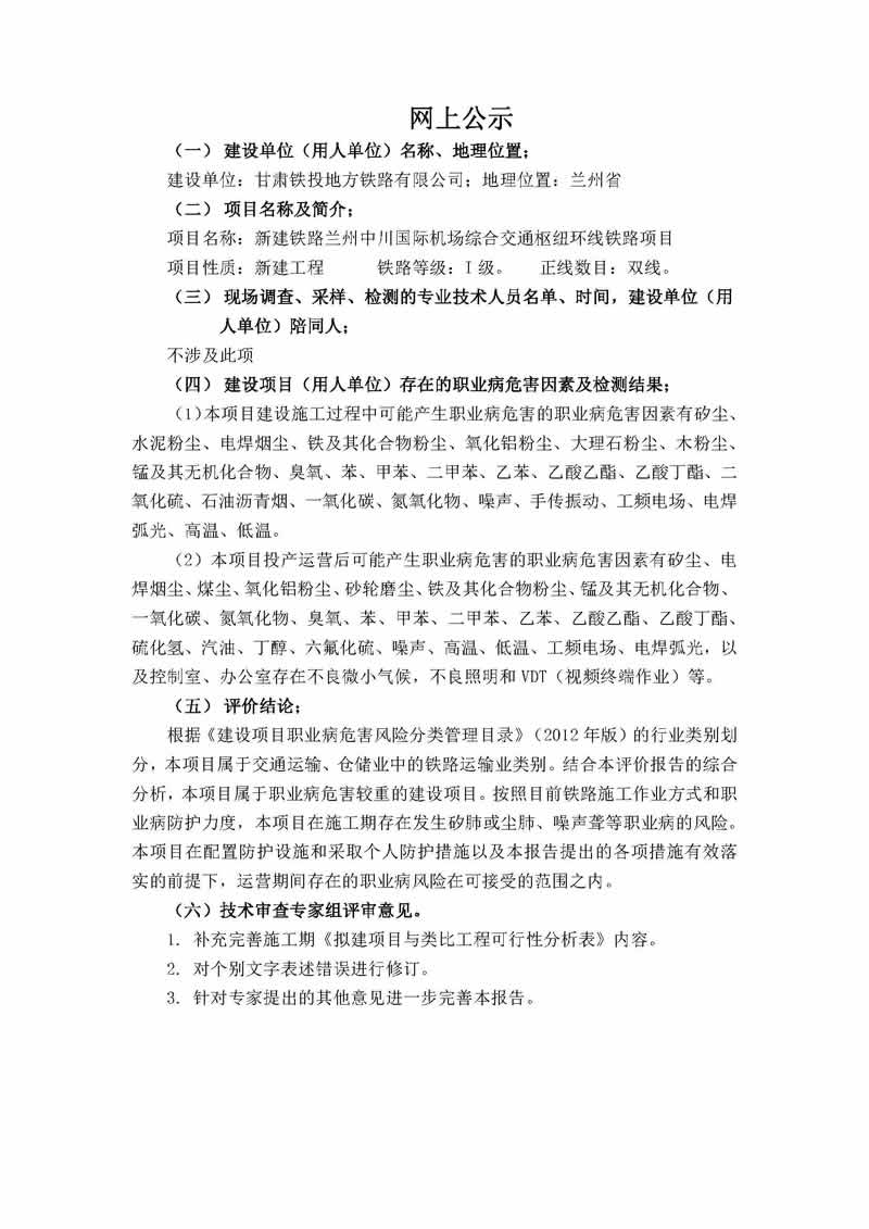 新建铁路兰州中川国际机场综合交通枢纽环线铁路项目职业病危害预评价